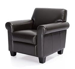 Manhattan classic style club chair design, features bonded leather upholstery. Comfortable furniture built with solid and sturdy wood frame. Chair's deep, high-density foam padding and rolled armrests provide ergonomic comfort.